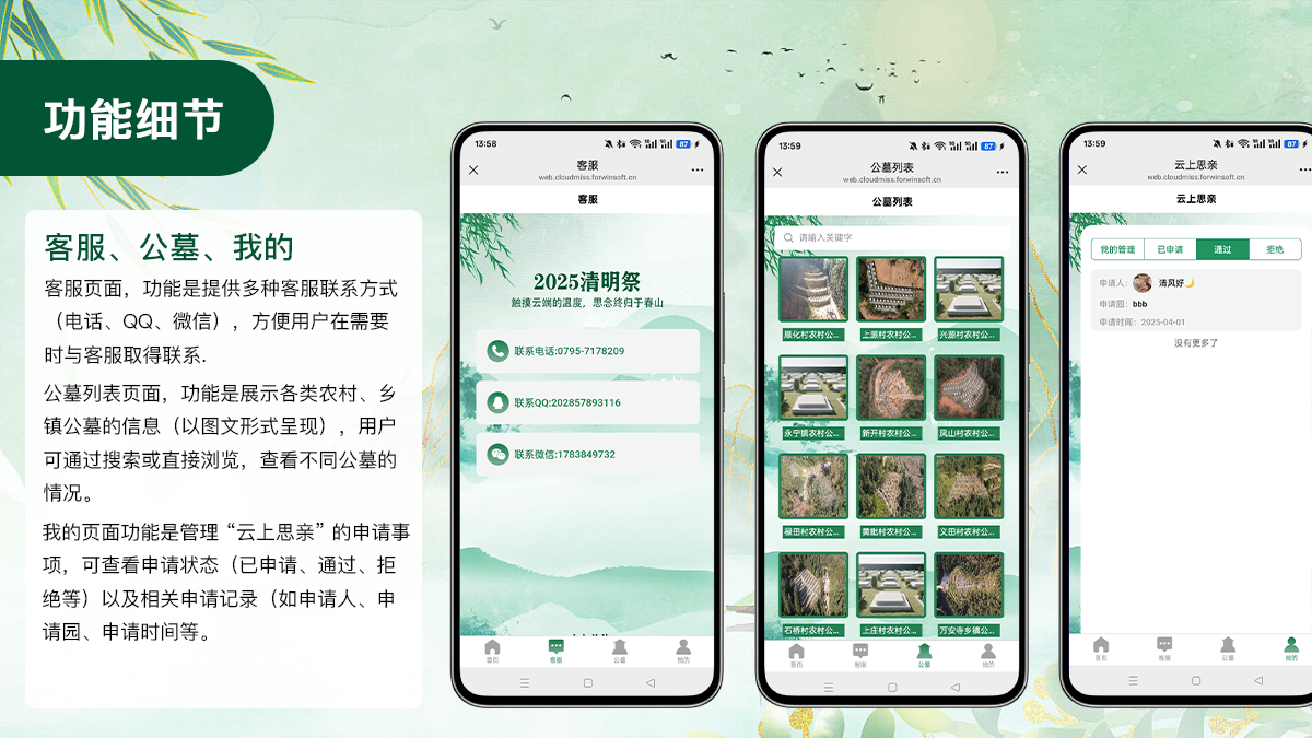 - 我的:集中管理个人相关信息,如个人资料、已申请的服务(建园、祭祀记录等)、收藏的纪念内容、消息通知等。