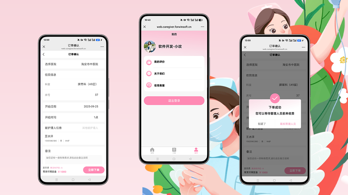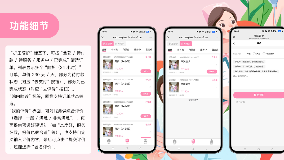 行业端:以数字化工具规范护工 / 陪诊服务流程,推动医疗护理服务的标准化、透明化发展,助力行业优化资源配置,更好地满足社会对医疗护理服务的需求。