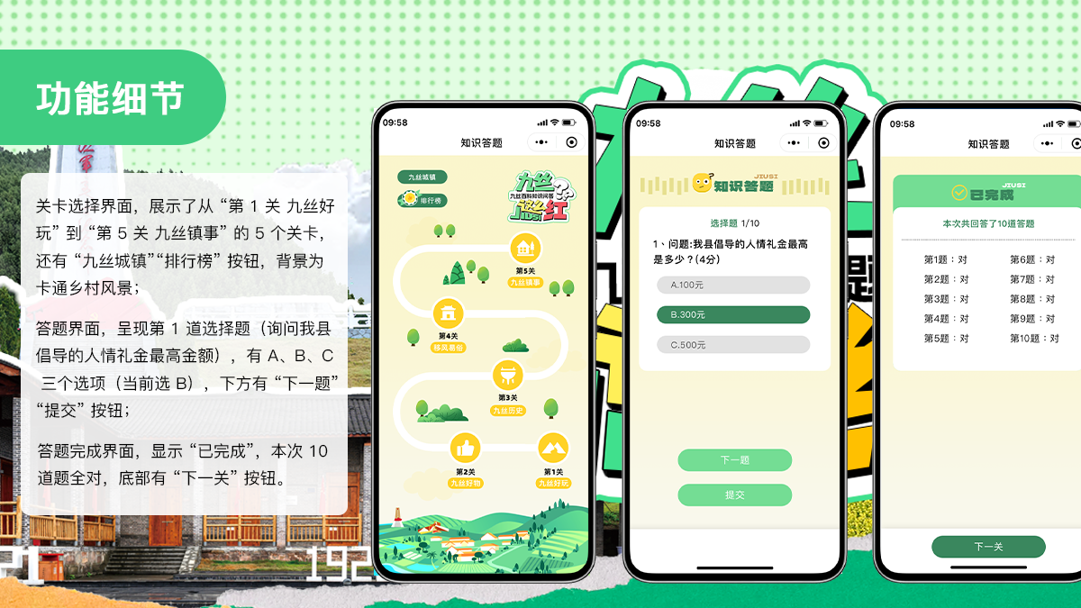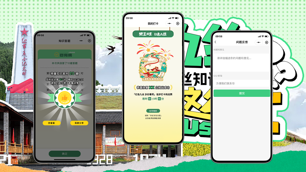 • 答题闯关:围绕九丝红色历史、民俗文化设置趣味题库,游客闯关成功可获得电子勋章,激发参与欲的同时,潜移默化传递文化知识。