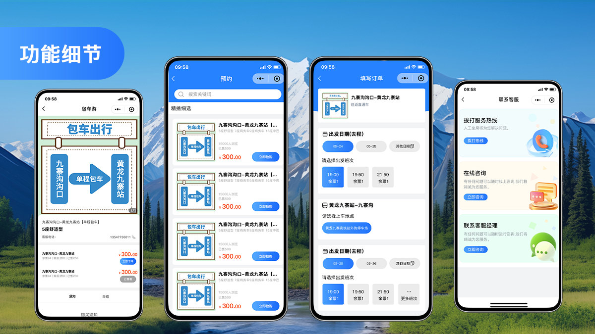- 提供预约时间选择、人数填写、服务类型(如单程 / 往返、含导览 / 纯交通等)选择等交互功能。