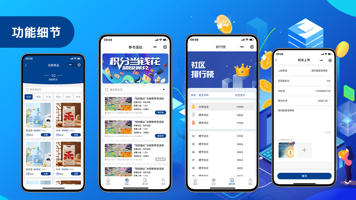 15. 常用功能快捷入口:与左侧图标对应,再次列出 “参与活动”“事件上报”“新闻动态”“兑换商品”,方便用户快速操作。