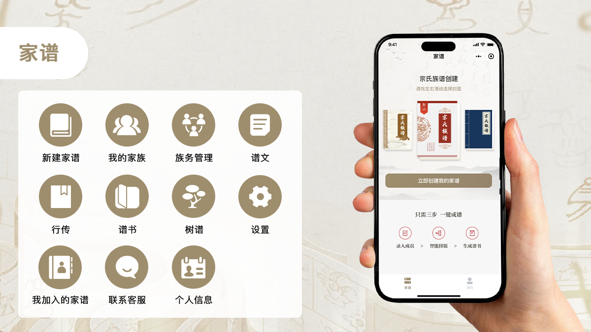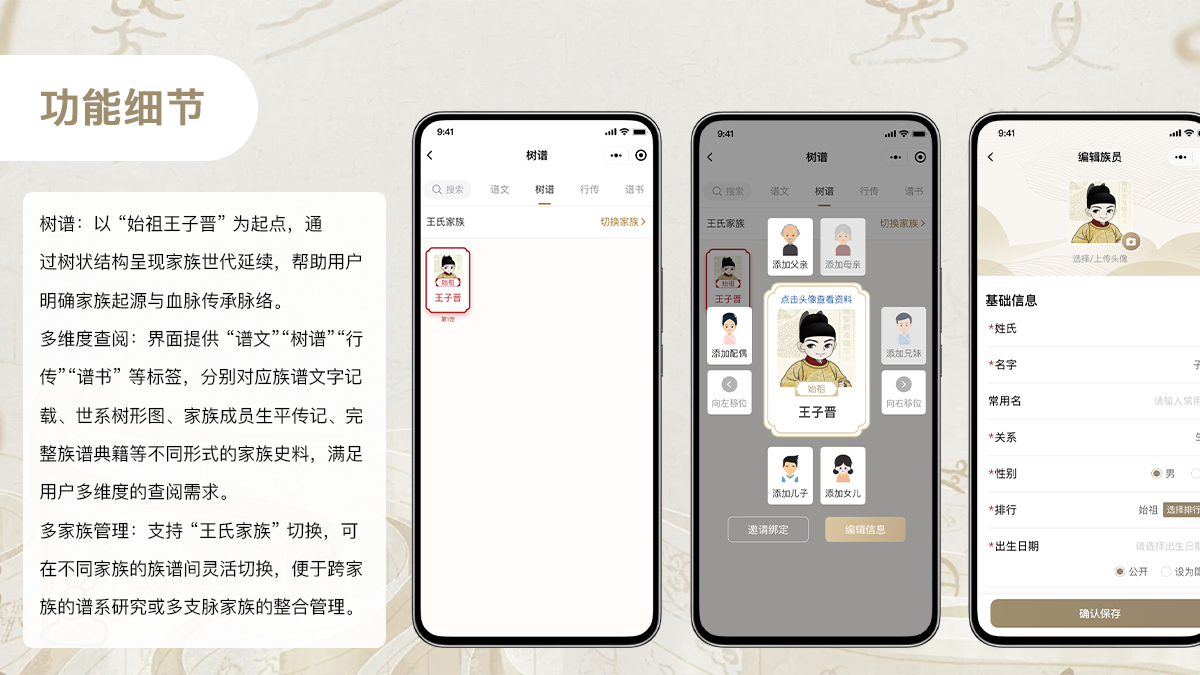 - 生成谱书:一键输出完整家谱文档,支持分享与下载。
