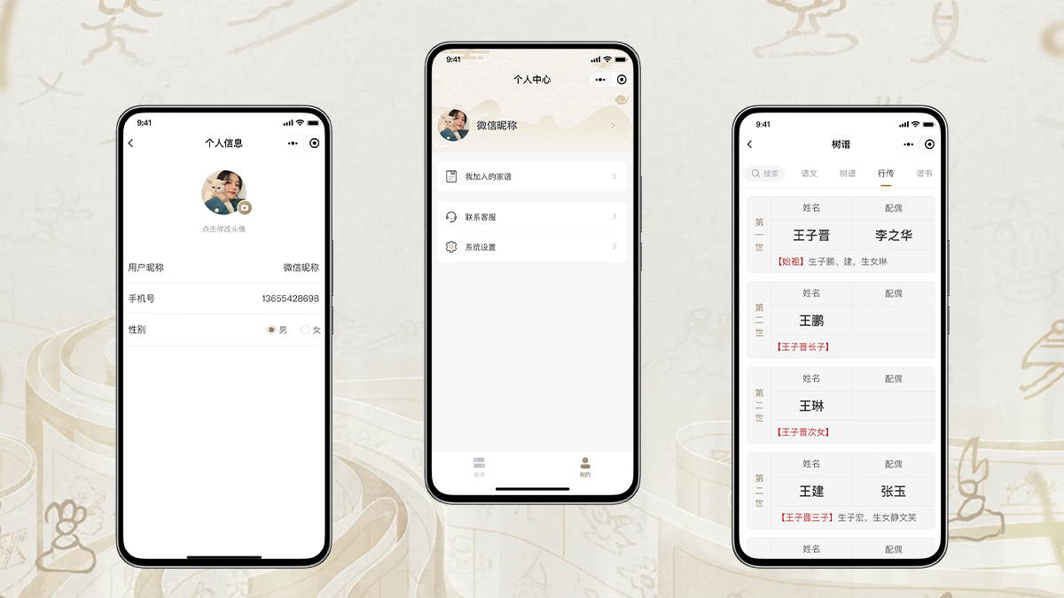 管理个人账户资料、绑定手机号、修改密码等基础设置。 - 一键成谱流程(手机端)