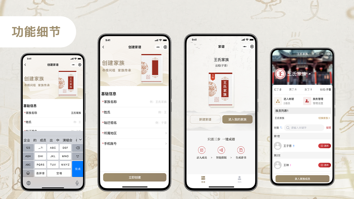 用户可自主创建新的家族谱系,选择封面样式(如传统红底金边、蓝皮古籍等),开启家族记忆的数字化旅程。 - 我的家族