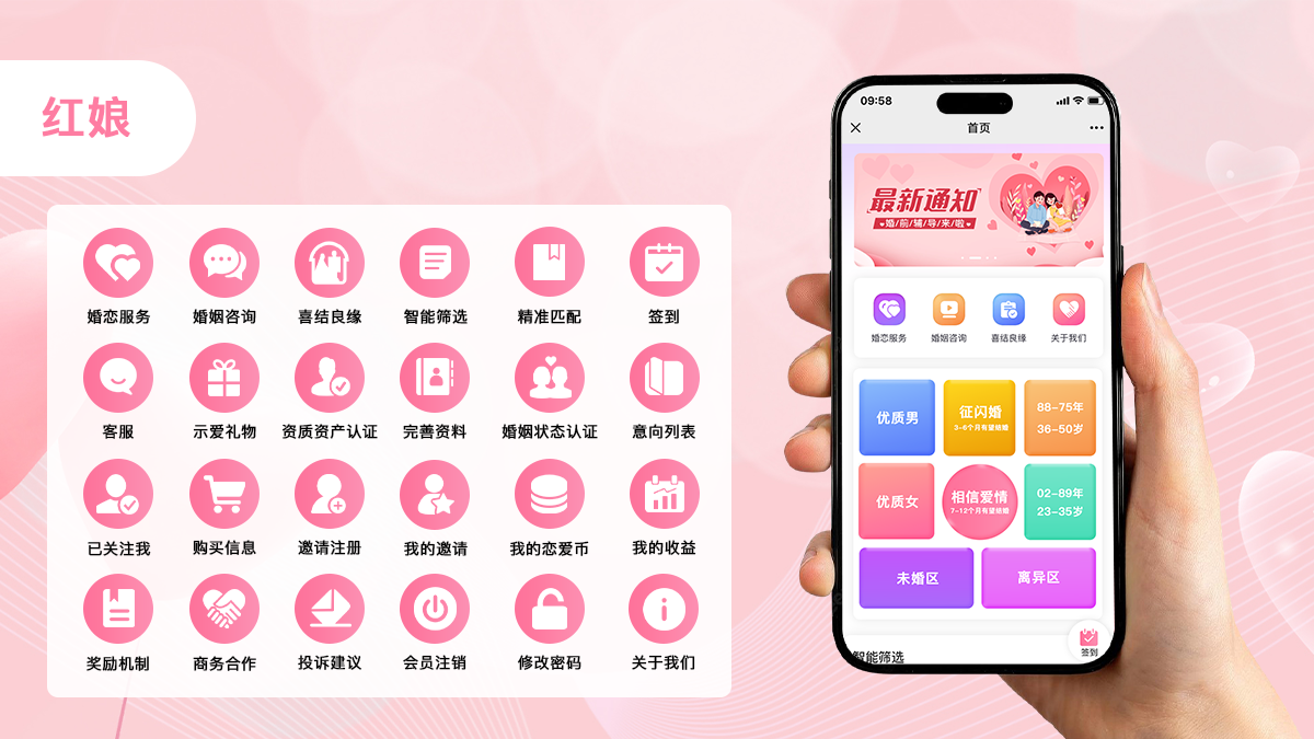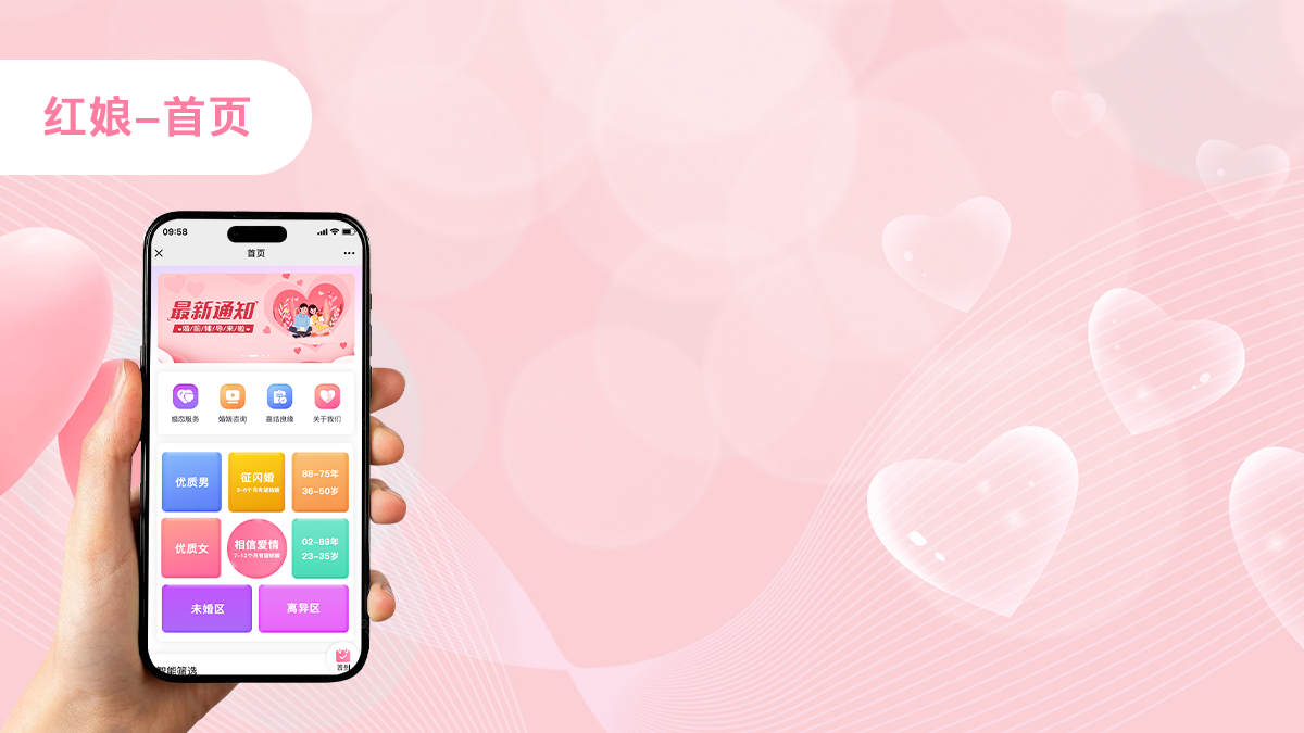 “红娘”是一款专注于婚恋交友的移动社交平台,以“成就幸福婚姻”为核心理念,致力于为单身人群提供真实、高效、安全的婚恋匹配服务。产品采用温馨浪漫的粉色主色调,界面简洁直观,功能丰富且逻辑清晰,覆盖从资料完善、智能匹配、情感互动到结婚筹备的全生命周期服务。
