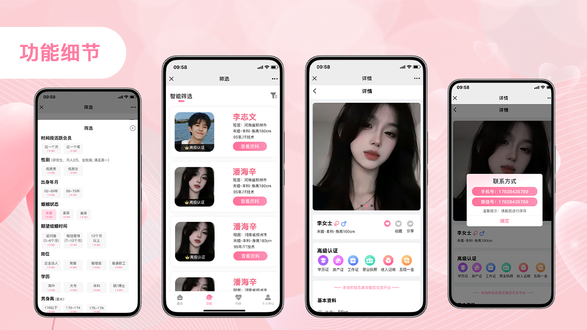 通过智能算法和分类推荐,帮助用户快速找到符合择偶标准的对象,避免无效社交。 - 信息真实,提升安全感