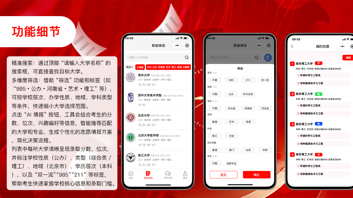 智能筛选 :选择类别(普通/艺术/体育)、是否高分线(不限/高分线/非高分线)、层次(不限/985/211/双一流)、招生范围(香港、澳门、台湾、华侨)性质(不限/公办/中外合办/民办)、科类(理工/文史)省份、专业。筛选院校;院校详情可查看招生计划、分数线、录取位次表;添加到志愿表可以编辑顺序、新增院校、专业。