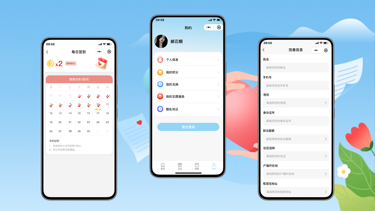 活动开始前或现场扫码签到,自动记录参与时间与地点,确保服务数据真实可靠,便于后续统计与表彰。 - 个人信息