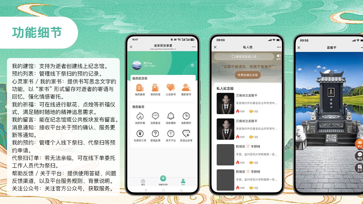 - 跨越时空祭扫:无论身处何地,都能随时访问纪念馆、发送祝福、参与祭扫,缓解“不能亲临”的遗憾。