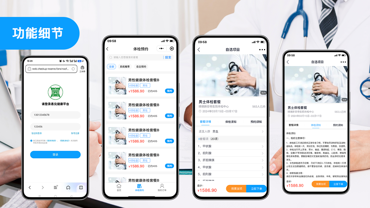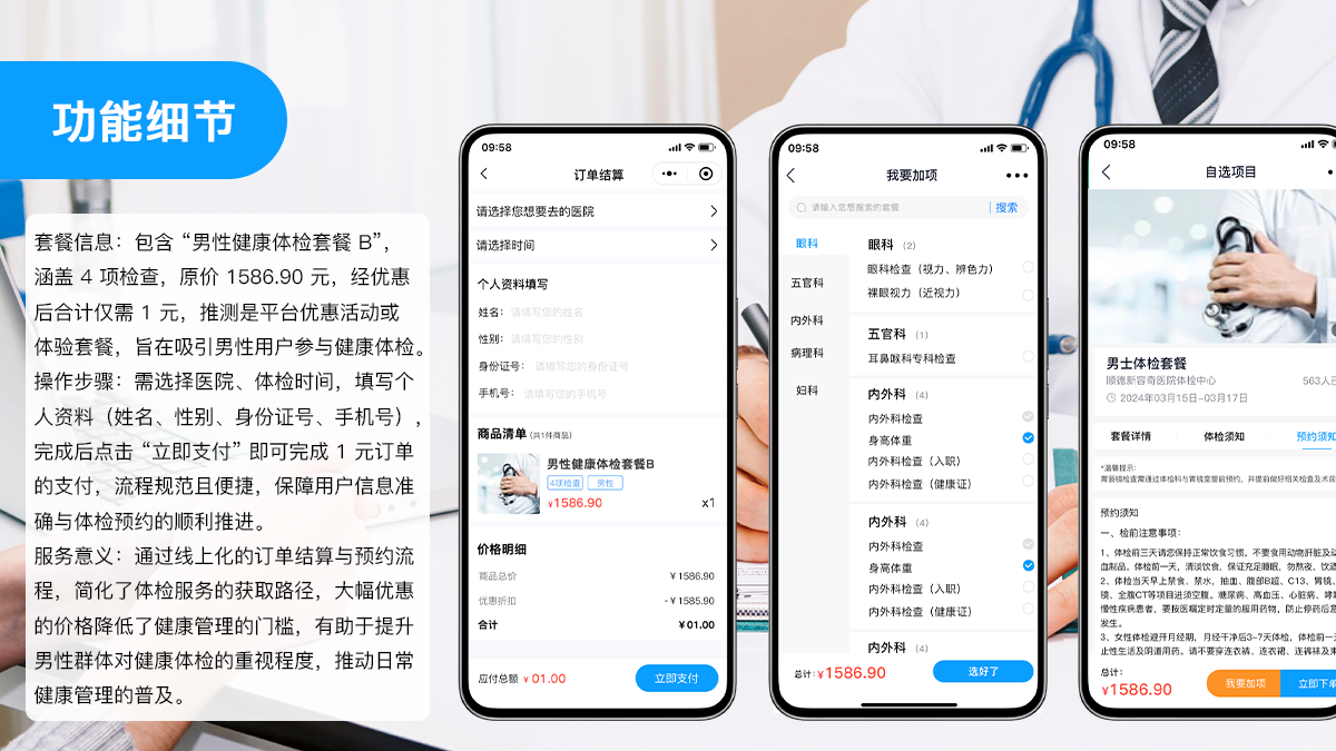 该应用面向关注健康的普通人群、企业员工、中老年家庭用户以及有特定健康需求的个体(如入职体检、婚前检查、慢性病筛查),支持按需选择体检项目、灵活安排时间、在线支付并生成电子订单,大幅提升了传统体检流程的效率与体验。
