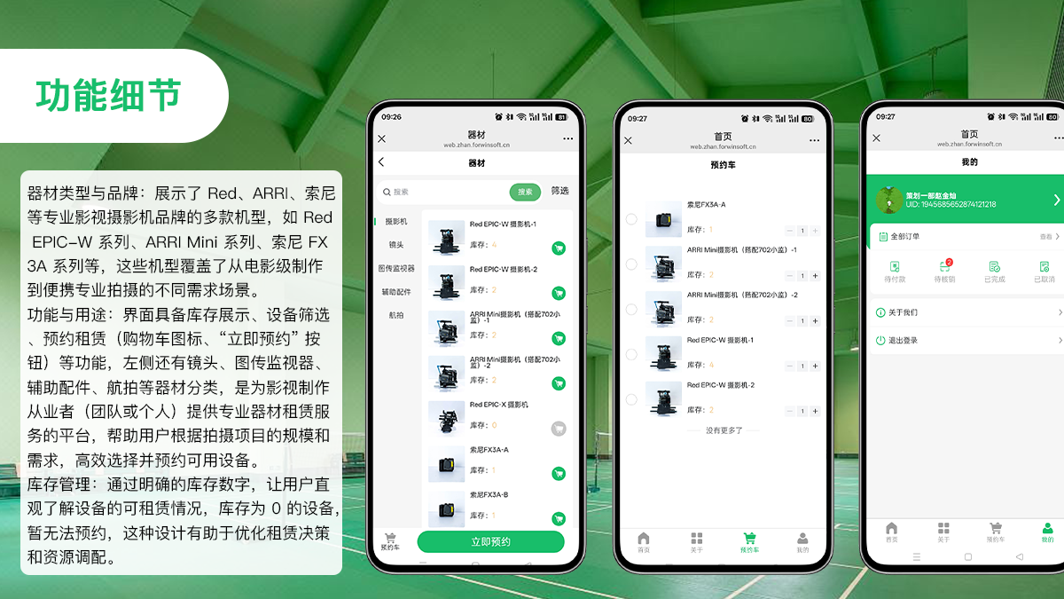 用户可选择具体场景与时间段,填写使用需求后提交预约申请,系统自动审核并生成订单。 - 支付与合同