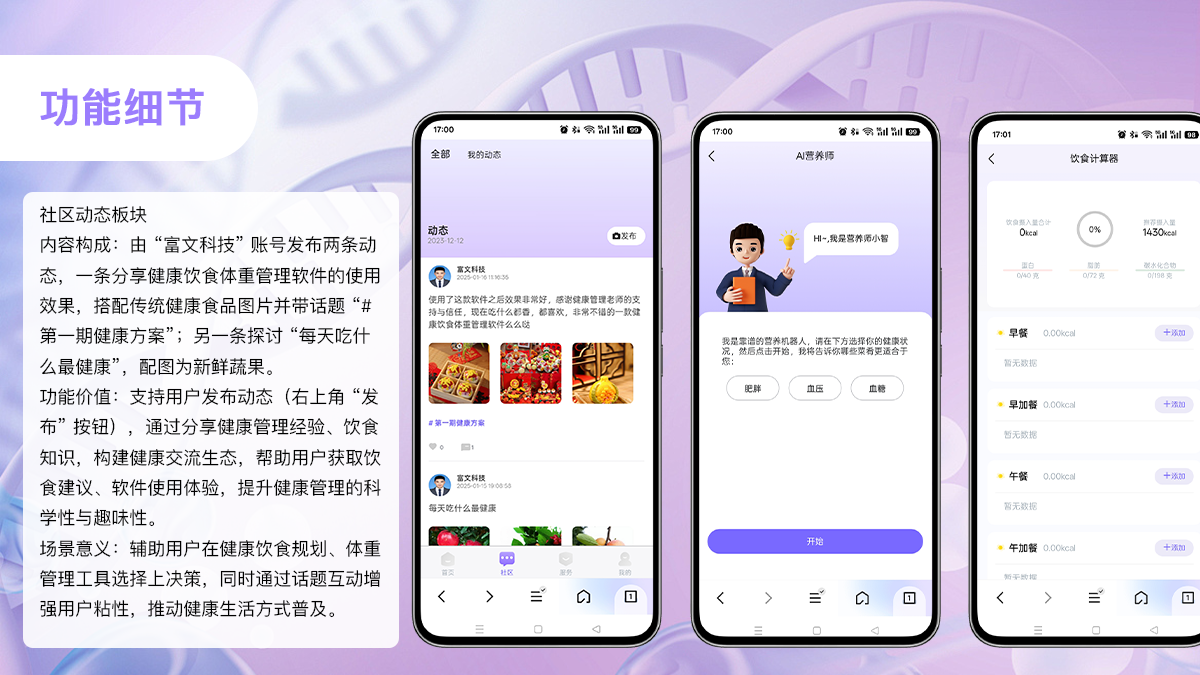 该应用面向关注健康的普通人群、亚健康状态者、慢性病患者(如高血压、糖尿病)、健身爱好者及中老年群体,提供基于个人体质、生活习惯和健康目标的定制化解决方案。平台以“科技赋能健康,数据守护生命”为核心理念,结合AI营养师、智能体脂秤、膳食数据库等工具,推动健康管理从被动治疗向主动预防转变。