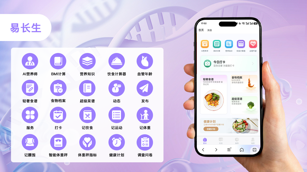 “易长生”是一款专注于个性化健康管理与慢病预防的智能健康服务平台,致力于通过AI技术、大数据分析和科学营养指导,帮助用户实现“吃得对、动得巧、活得久”的健康生活目标。平台融合了营养评估、饮食管理、运动记录、体重监测、健康计划等多功能于一体,打造从“数据采集—行为干预—效果追踪”的全流程健康管理闭环。