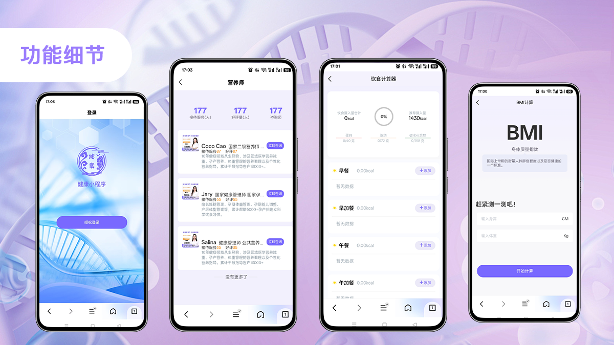 输入身高体重自动计算BMI指数,并给出健康等级判断(偏瘦、正常、超重、肥胖),辅助用户了解身体状态。 - 营养知识