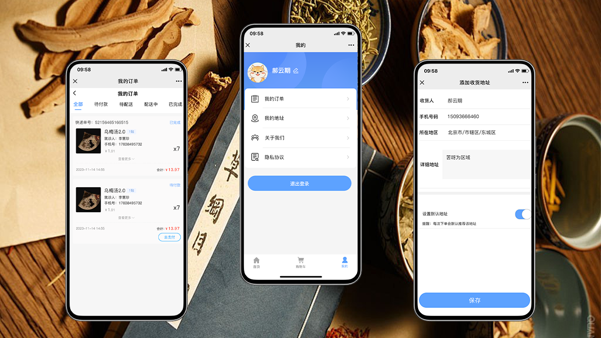 查看所有已下单的药品记录,包括待付款、待发货、运输中、已完成等状态,支持订单详情查询、物流跟踪与售后申请。 - 我的地址