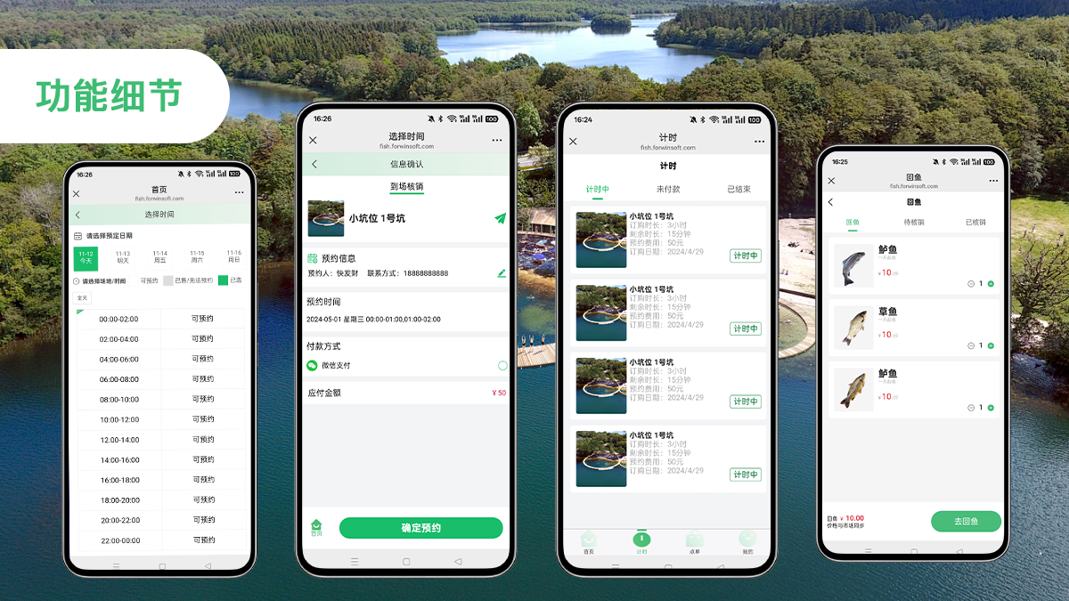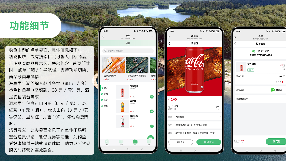 在线订购饵料、饮料、餐食、烧烤套餐等配套服务,支持现场扫码支付,减少排队等待。