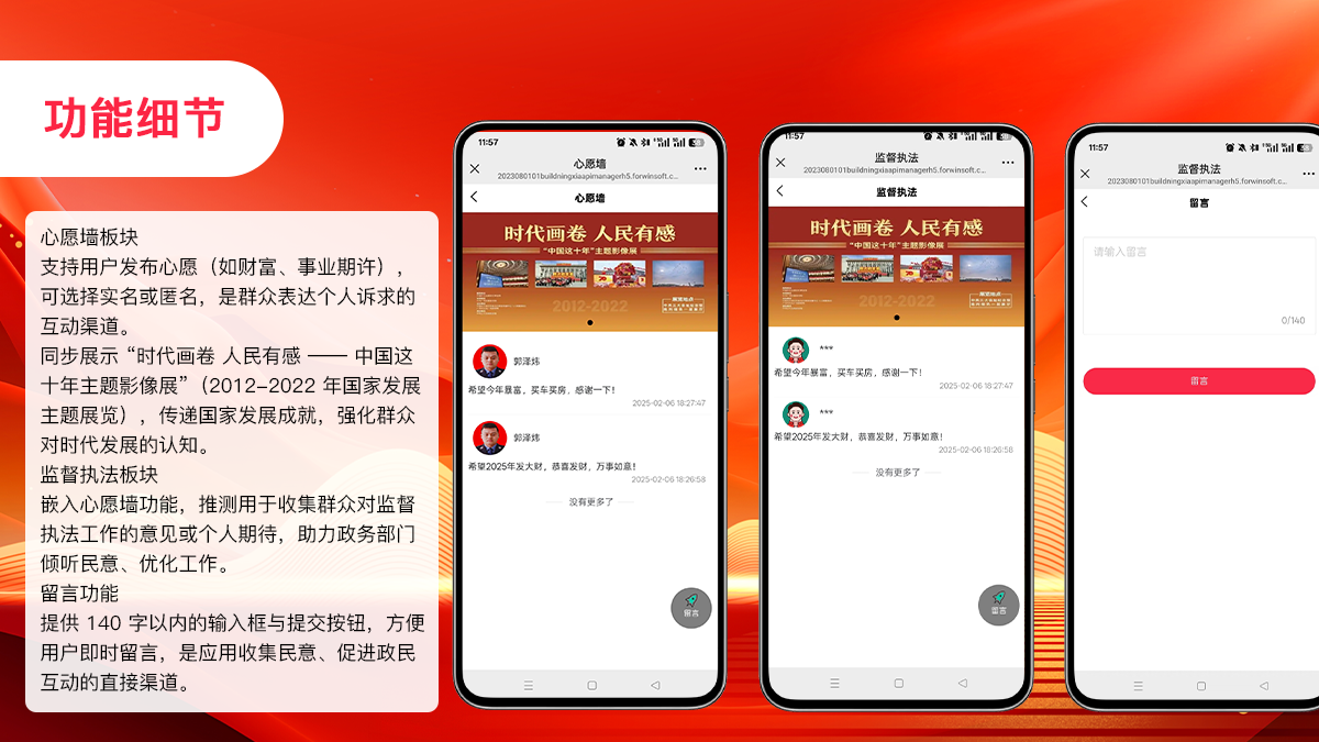 “中心组学习”“考试中心”等功能促使党员主动学习政治理论;“心愿墙”“监督执法”则赋予党员表达权利,激发主人翁意识,增强组织凝聚力。 - 构建新时代政民互动新机制