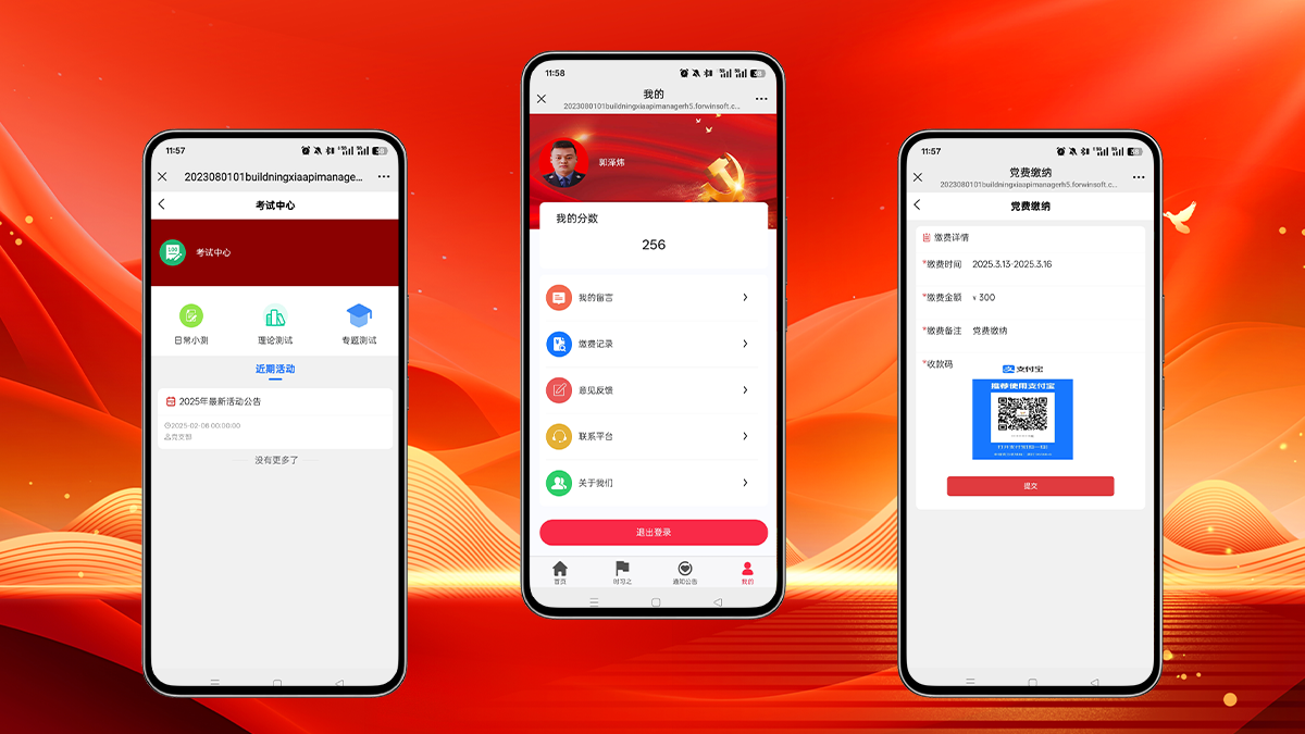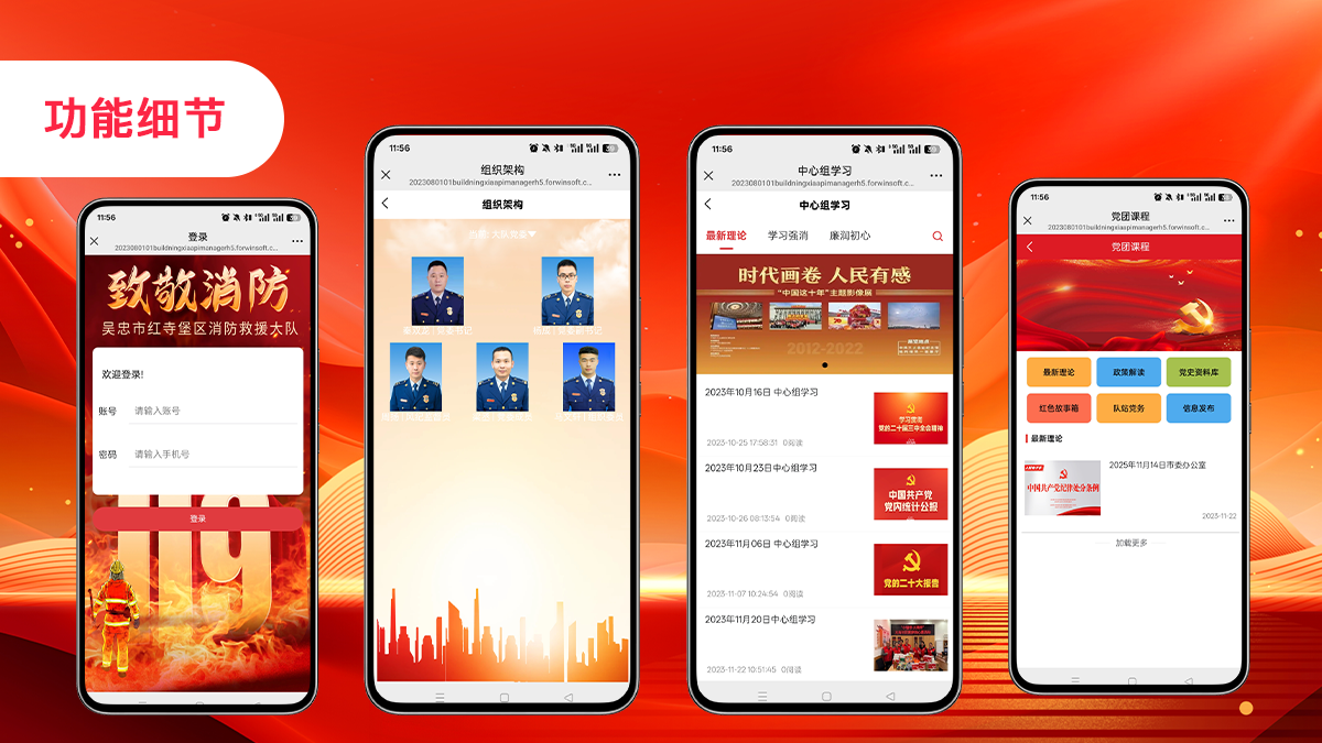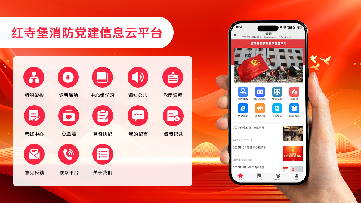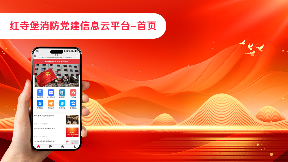整体界面采用红色主色调,融合党徽、红旗、消防元素及现代化视觉设计,彰显政治性、专业性与时代感。平台支持手机端随时随地访问,实现党建工作从“线下为主”向“线上协同”的转变,助力新时代消防队伍党建工作高质量发展。