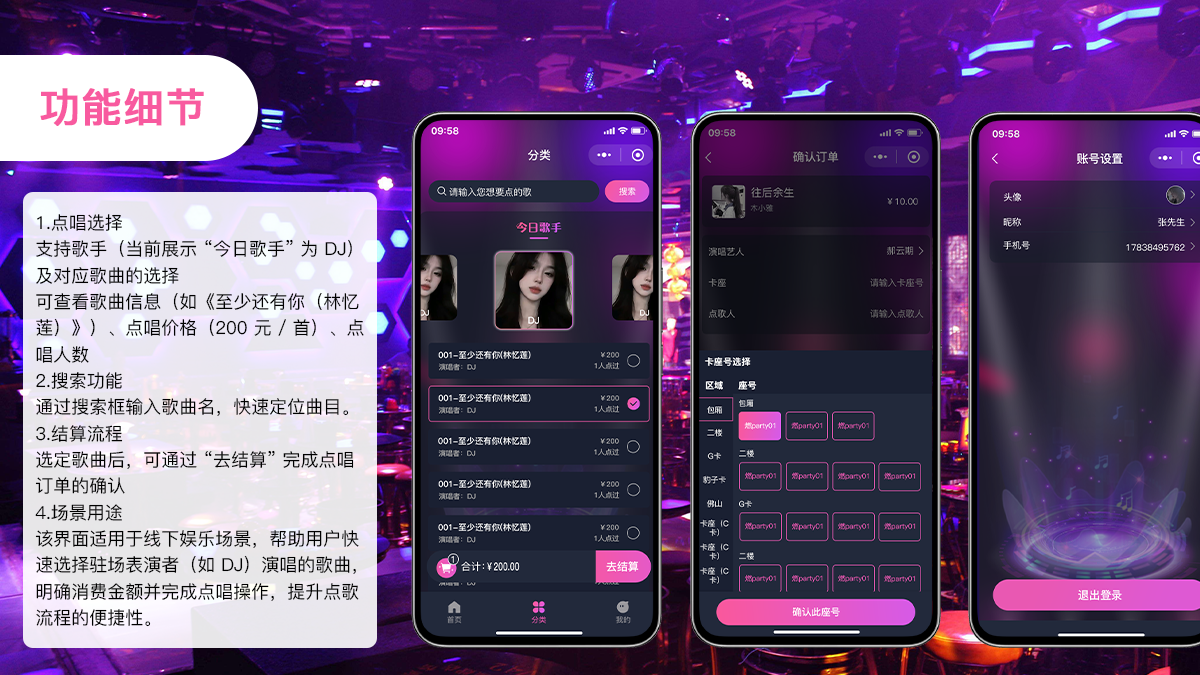 我的:查看点歌列表、歌曲状态、账号设置、用户头像昵称手机号更换、切换艺人端