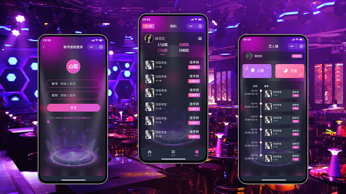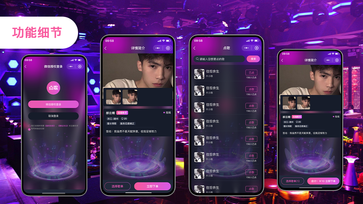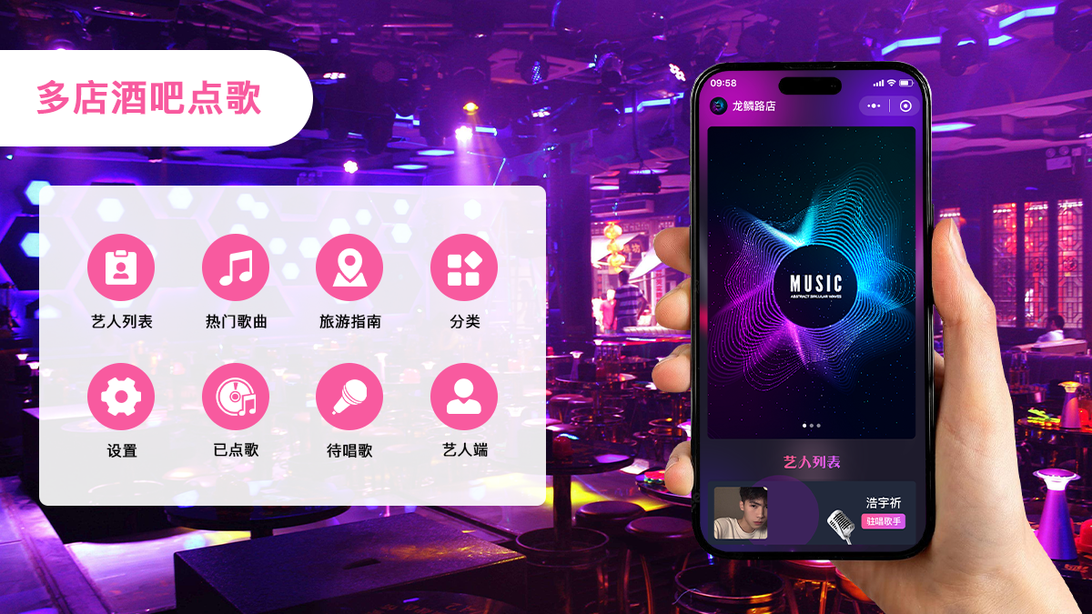适用于多店点歌小程序,一店一码,多店独立后台。支持设置歌单自动刷新、支持设置时间段点歌限制。适用于酒吧、清吧等场合、提供歌手入驻、方便结算歌手收益。