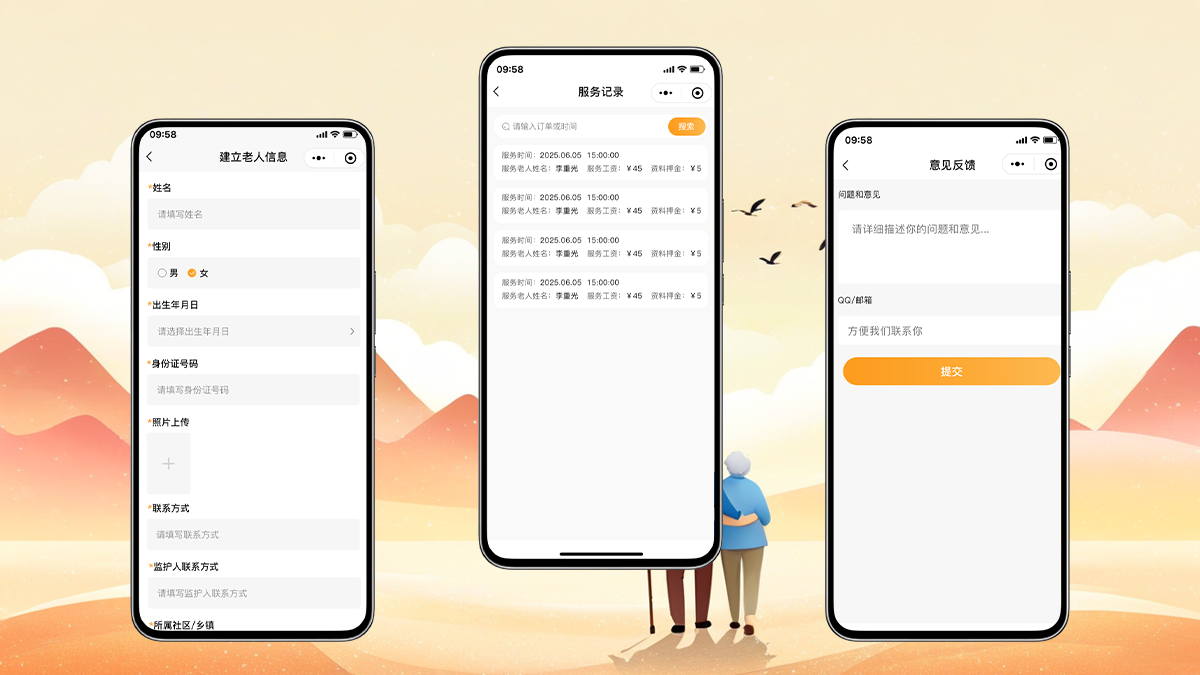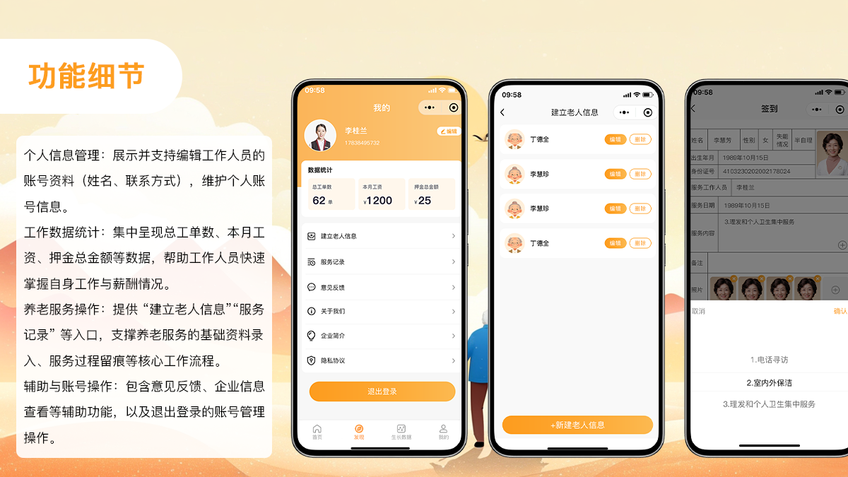 软件功能工作流程:围绕养老院的老年人,系统固定服务的老人,提前录入老人基本信息,服务人员用手机进行选择老人,填写老人的状态信息,一年会针对老人填写多次信息,后台能查看老人信息,进行导出下载