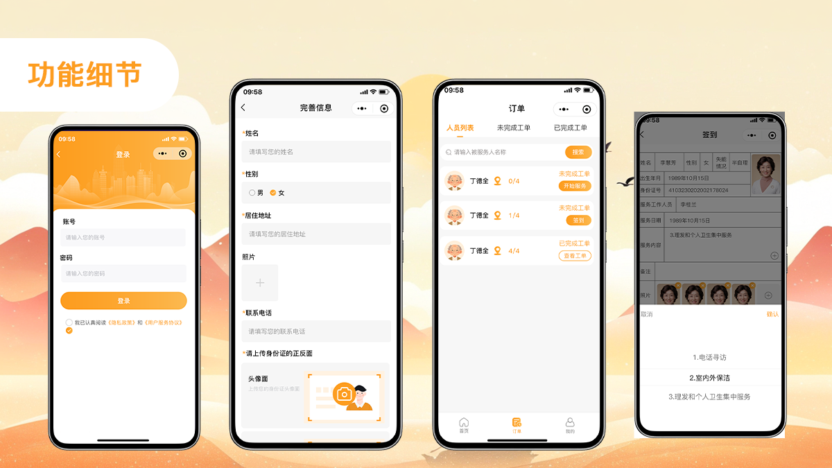 1.服务人员管理:展示服务人员信息,姓名,性别,居住地址,自拍大头照(不必填),联系电话,身份证正反面,工资结算银行卡账号,本月服务多少次,本月服务工资,累计资料押金