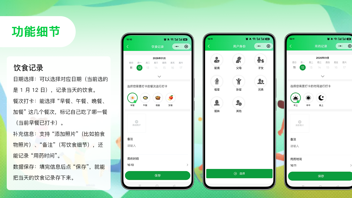 - 核心用户:关注家人健康的家庭主妇/主夫、中老年人(需子女协助操作)、有慢性疾病(高血压、糖尿病等)患者的家庭