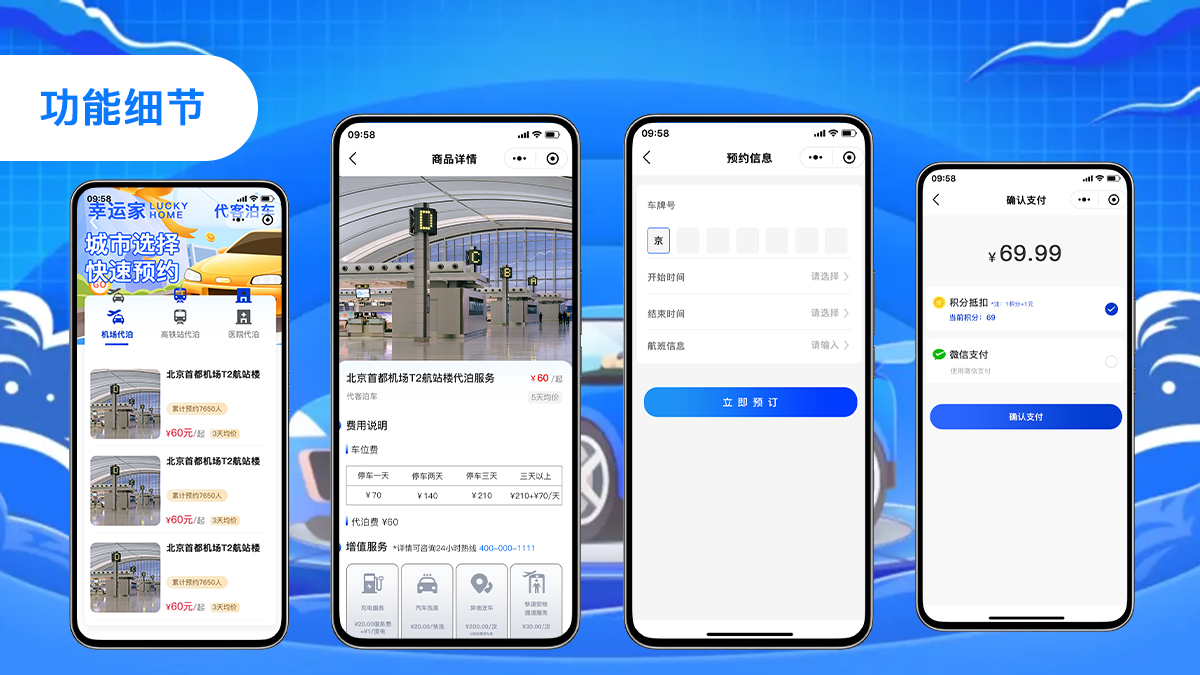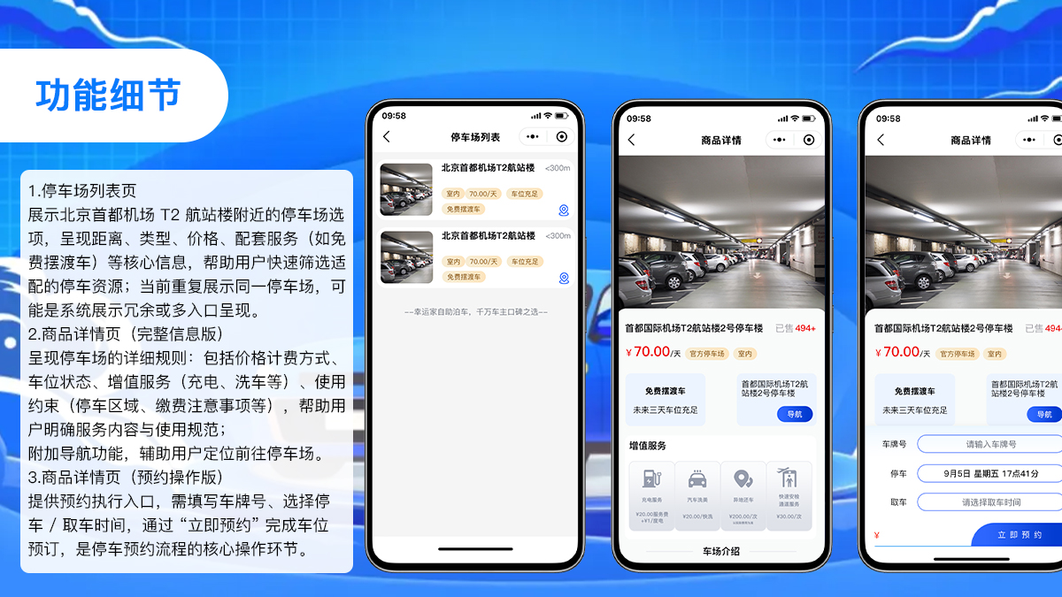 软件功能工作流程:围绕机场代客泊车,医院代客泊车,为服务代替客户泊车预约下单的一个小程序,分为用户端和泊车师傅端,两个手机端口。