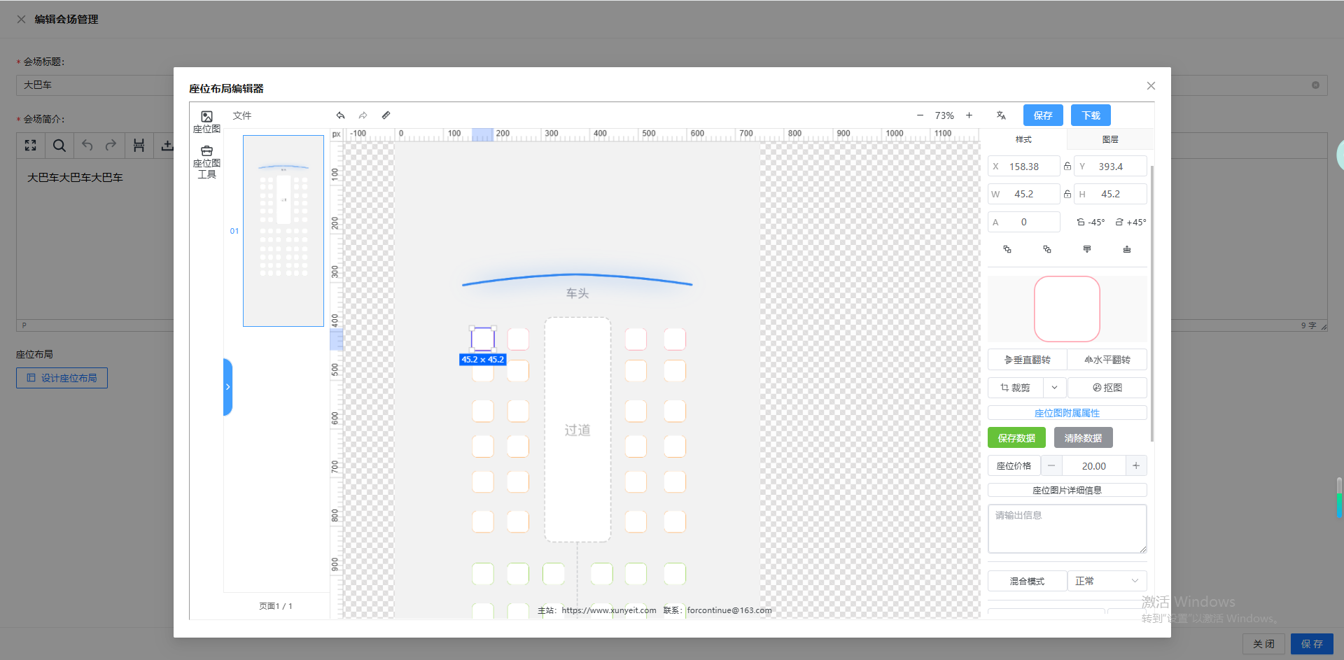 • 视图控制:支持画布缩放(如当前 73% 比例),可放大精细调整座位间距,或缩小查看整体布局效果。